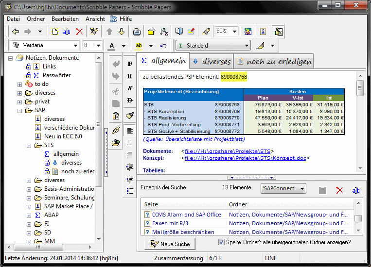 Die Abbildung zeigt eine exemplarische Ordner- und Seitenstruktur. Einzelne Seiten wurden mit bestimmten Status versehen. Im rechten Editorbereich befinden sich Textnotizen, ein eingebettetes Tabellenkalkulationsblatt (siehe Objekte) und Hyperlinks auf Dateien. Darunter befinden sich Suchergebnisse der letzten Suche bzw. gespeicherte Suchergebnisse.